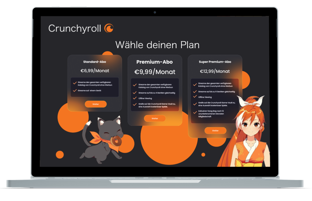 In my redesign, I prioritized preserving the brand's identity by using their iconic orange for key elements like buttons, check mark icons, and circle graphics. To enhance the anime theme, I integrated the Crunchyroll mascot and her cat into the memberships page, adding a cute and inviting touch. Additionally, I increased the font size of the Premium Subscription option to draw more attention and encourage users to choose this membership.